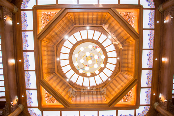 明清閣該案例藻井穹頂如傘蓋隆起,榫卯精工構(gòu)筑,無需一釘而穩(wěn)如磐石。木質(zhì)的框架結(jié)構(gòu)搭配細(xì)膩的雕刻與彩繪,每一格中都蘊(yùn)含著中式傳統(tǒng)圖案的韻味,在燈光的映照下,更顯金碧輝煌,為整個空間增添了一抹大氣與莊重。其形上圓下方,合"天圓地方"之道,非惟裝飾,更乃禮制象征,唯皇家與敕建寺觀可享,彰顯封建等級之尊。